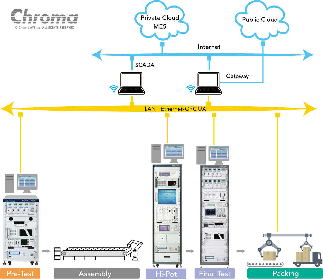 Chroma 8000自动测试系统适合现代化的大规模量产生产线,可搭配支援Chroma Sajet制造资讯系统(Manufacturing Execution System, MES)进行测试站别、人员、产品序号及测试程式的控制与管理,以及测试数据上传中央伺服器功能,达到测试程式集中管理与数据资料搜集/报表分析等应用,协助客户完成智能工厂之目标,提高产品品质、效能,降低生产成本,创造企业利益最大化。另Chroma可提供客制化Shop-Floor控制系统服务,连结客户厂内既有MES,到目前为止已协助众多海内外世界级制造大厂完成MES系统整合之实绩案例。