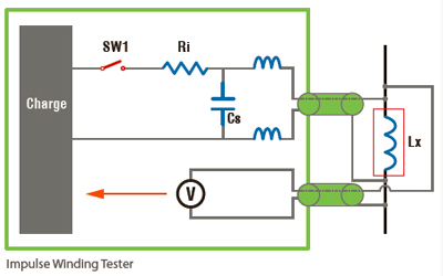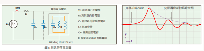 所谓的『绕线元件脉冲测试』基本上是以一『非破坏性』、高速、低能量之电压脉冲施加在待测物上,以一脉冲电压加于并联线圈的振荡电容(Cs)上,使 并联电容与线圈产生LCR振荡,观察振荡衰减情况来了解线圈内部状态,包含线圈自体之线圈感量及并联电容量(Cw)等状态(如图1: 测试等效电路图 ) ,再藉由分析/比对待测物良品与不良品之等效波形以达到判定良否之目的。绕线元件脉冲测试主要功能乃在早期发现绕线元件中各种潜在之缺陷,例 如:绕线层间短路、电极焊接不良、内部线圈或磁芯,不良等。